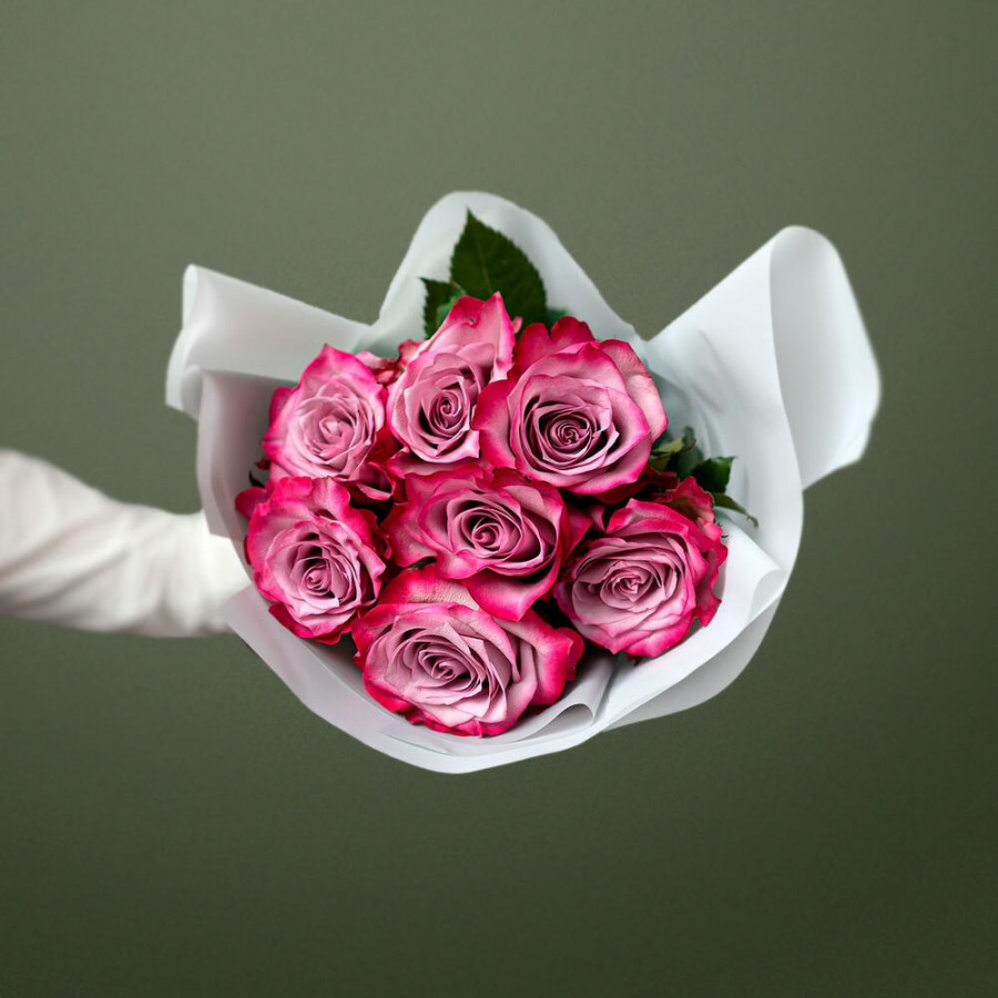 На фото букет из 7 фиолетовых роз. В составе: роза 7 шт, дизайнерская упаковка 1 шт, атласная лента 1 шт, . Все цветы свежие и ароматные, букет красиво оформлен и отлично подходит для подарка. Доступна доставка цветов или самовывоз.