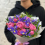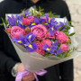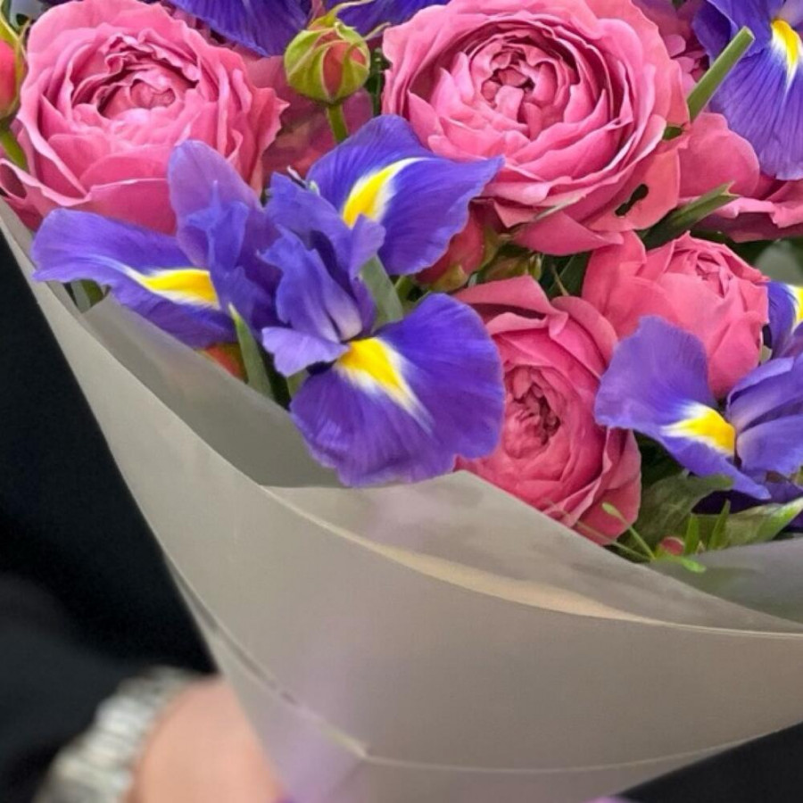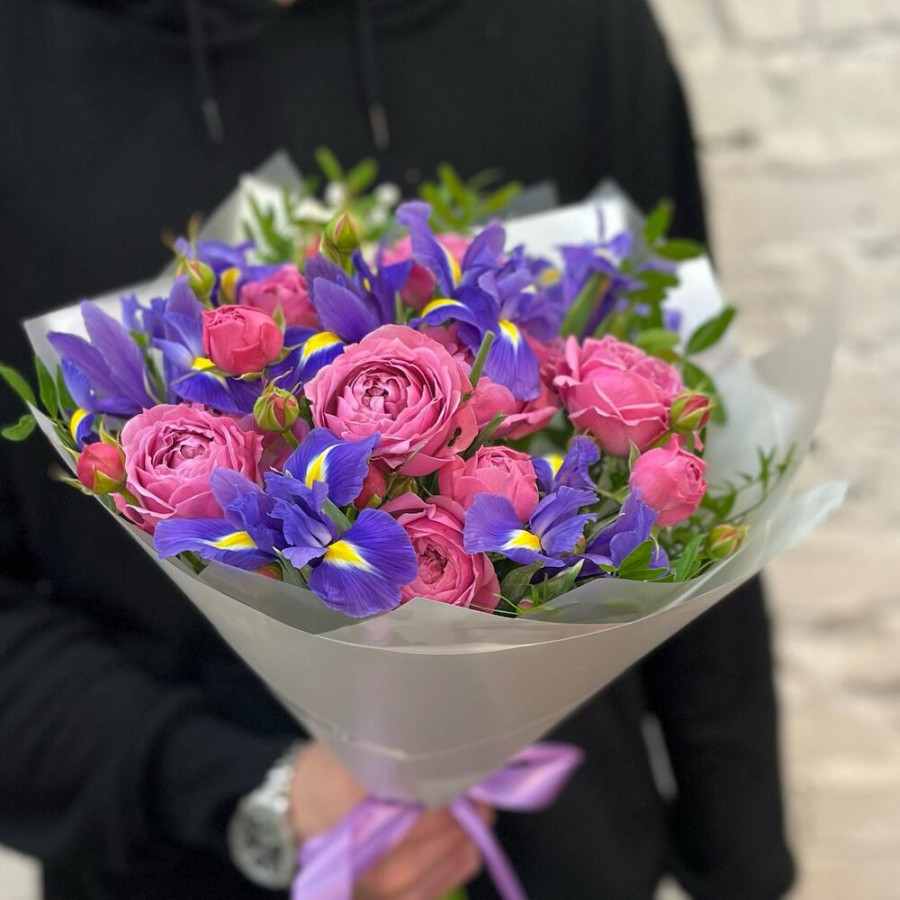 Букет из розовых пионовидных роз и синих ирисов в Канаше