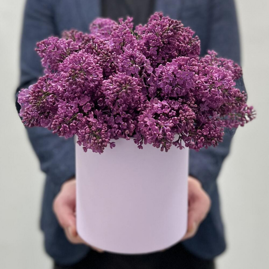На фото сирень в шляпной коробке. В составе: сирень 11 шт, оазис флористический 1 шт, коробка (s) 0 шт, . Все цветы свежие и ароматные, букет красиво оформлен и отлично подходит для подарка. Доступна доставка цветов или самовывоз.